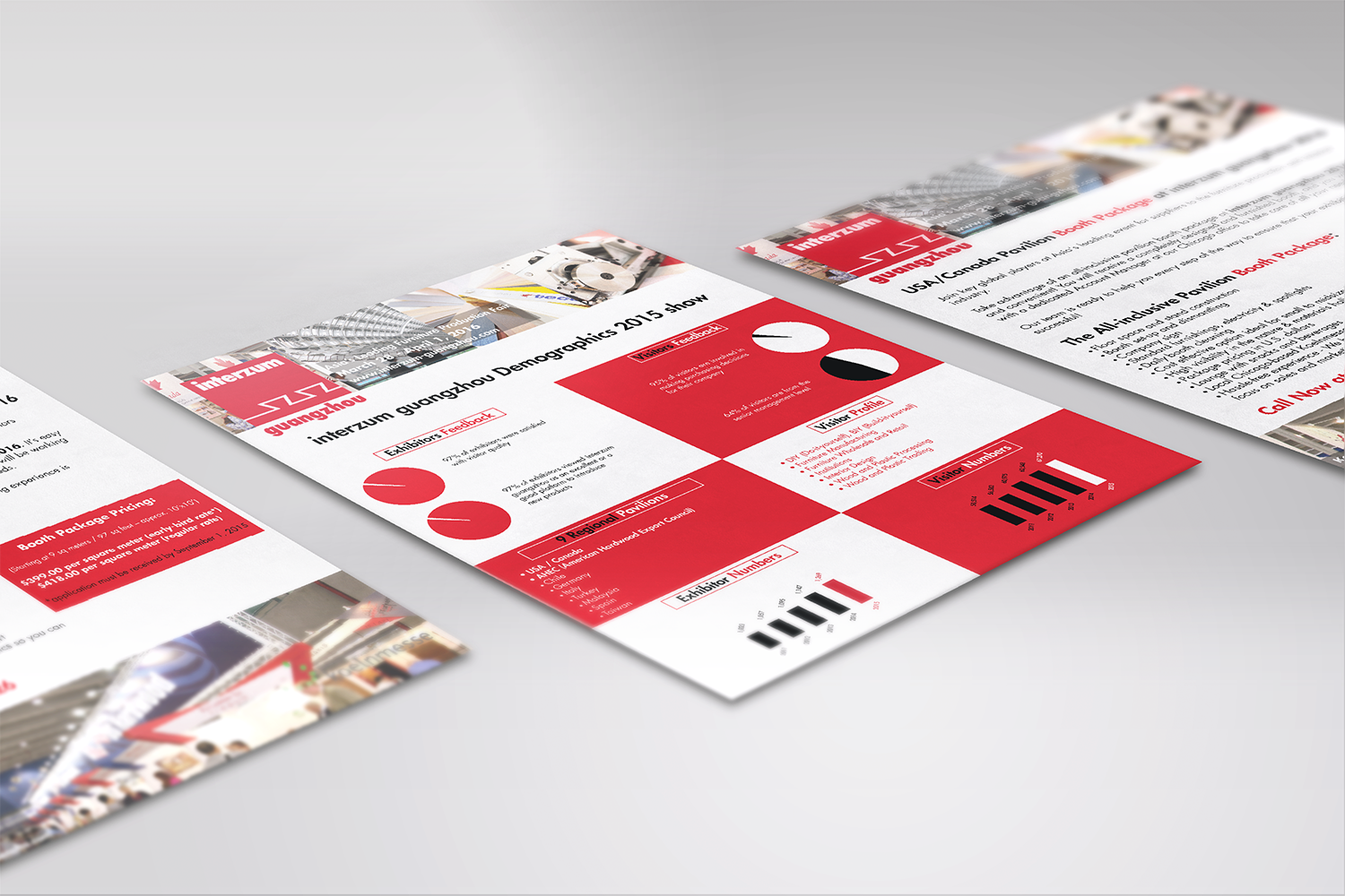 Flyer for furniture trade show in Guangzhou, China interzum 2016 with visual data from the previous year. Done at my internship with Koelnmesse.